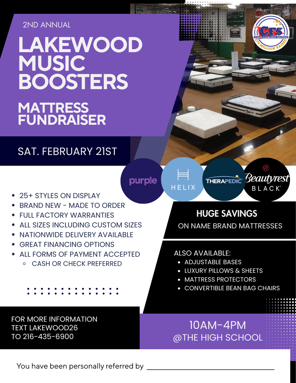 Over 20 mattress styles will be on display at this event! Come check out the selection. All brand new- made to order! Delivery to your home. Financing available. Portion of the proceeds go to support music programs in Lakewood City Schools. Open to the public.